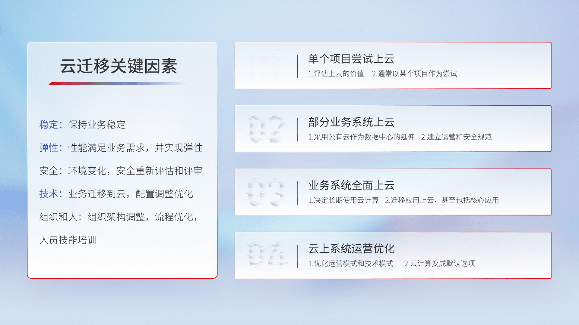 结合实际业务,,,,从规划设计、、云平台选型、、、、云原生改造、、、数据迁移、、、、集成交付,,,,迁移全过程为客户识别最佳上云路径,,做好风险识别管理,,,设计网络架构、、身份权限、、安全审计合规、、、、操作审计、、、日志审计、、、监控告警策略、、、、多站点容灾设计等,,对云上基础设施进行整体规划,,提升IT治理水平,,,,以满足弹性、、、高可用、、、高性能的需求。。。。