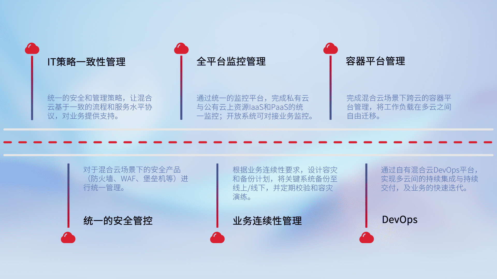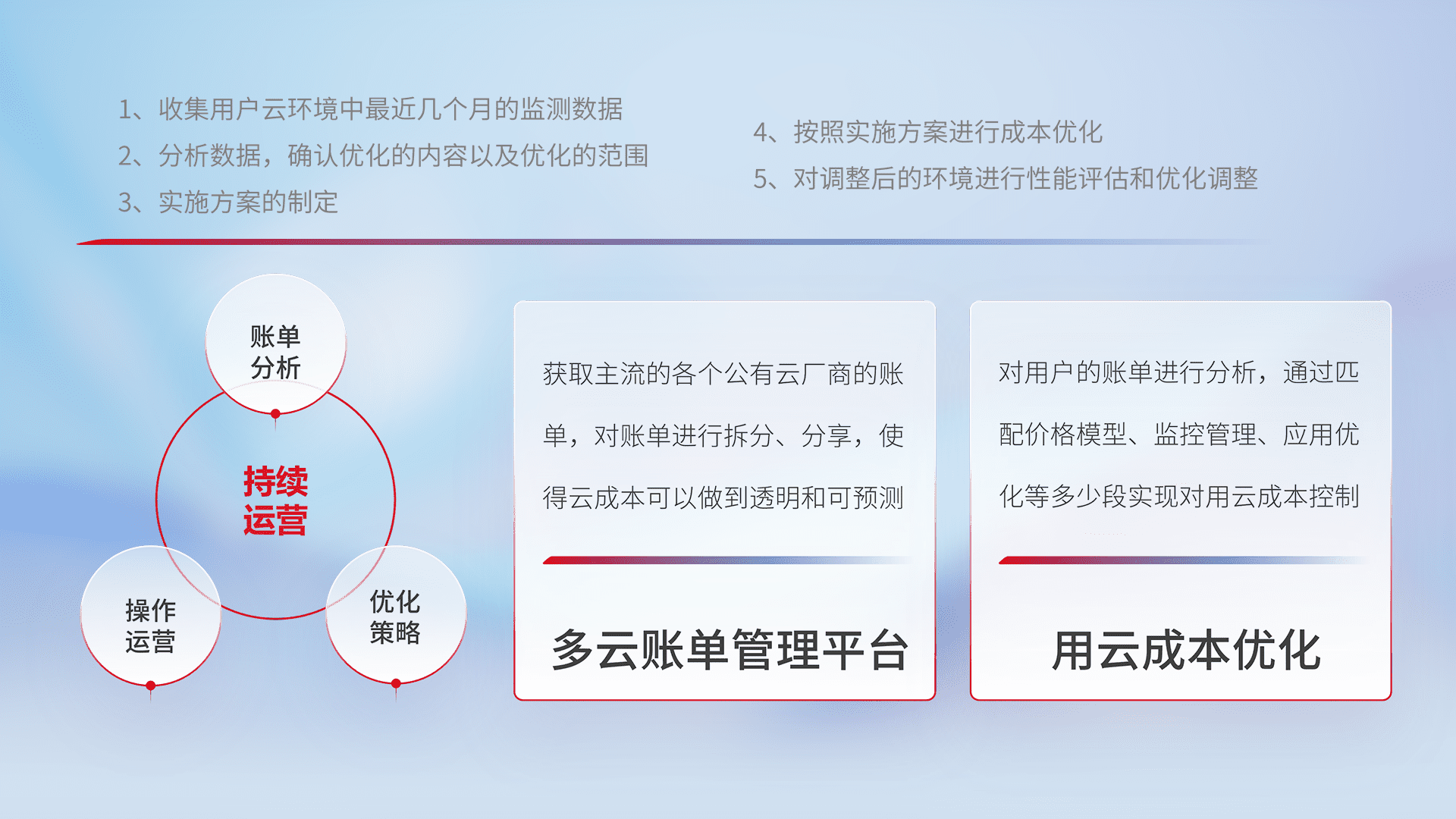 通过多云纳管,,以统一的资源数据模型把客户的云资源进行抽象和封装,,进而实现对多云资源的统一操作,,,保障云资源管理的可靠性、、、、稳定性与可用性。。。。量身定制化运维内容,,配置、、、、开发运维、、补丁管理、、、备份、、监控、、认证和访问管理、、审计和日常巡检等,,保障在用云过程中的可靠度,,,稳定度以及高可用率。。