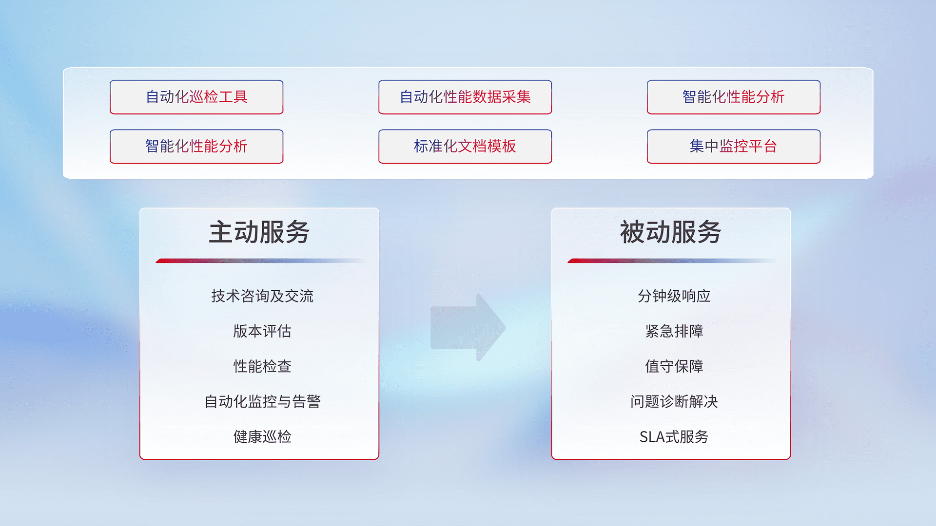 智能化工具和标准化文档,,,,保障服务质量,,提供主动服务(包含技术咨询、、、、版本评估、、、、性能检查、、、自动化监控与告警、、健康巡检)和被动服务包含(分钟级响应、、、、紧急排障、、、、值守保障、、、问题诊断解决、、SLA服务)。。